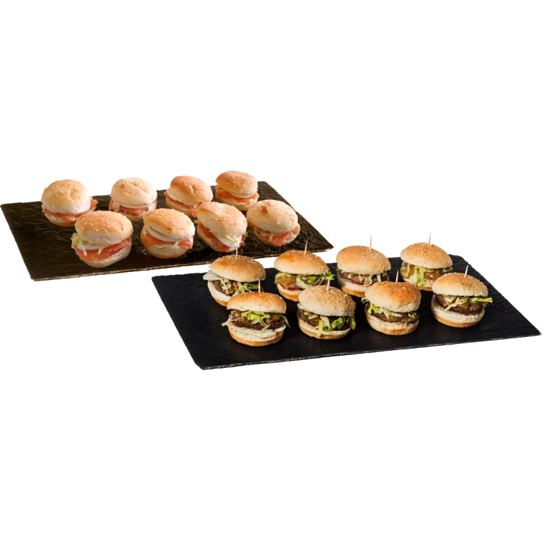 Mini Hamburguesas de Vacuno, (Pan con SÉSAMO) Cebolla caramelizada, lechuga, Keptchup y MOSTAZA
